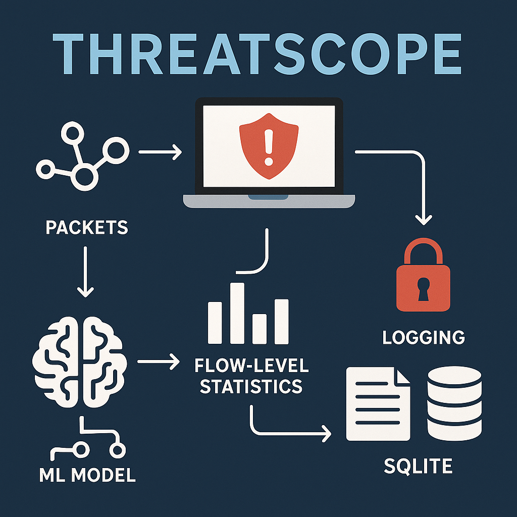 ThreatScope is an cybersecurity and machine-learning project that performs real-time network intrusion detection. It captures packets, computes flow-level statistics, applies a trained ML classifier (Random Forest or XGBoost), and logs malicious traffic through a REST API or SQLite database.