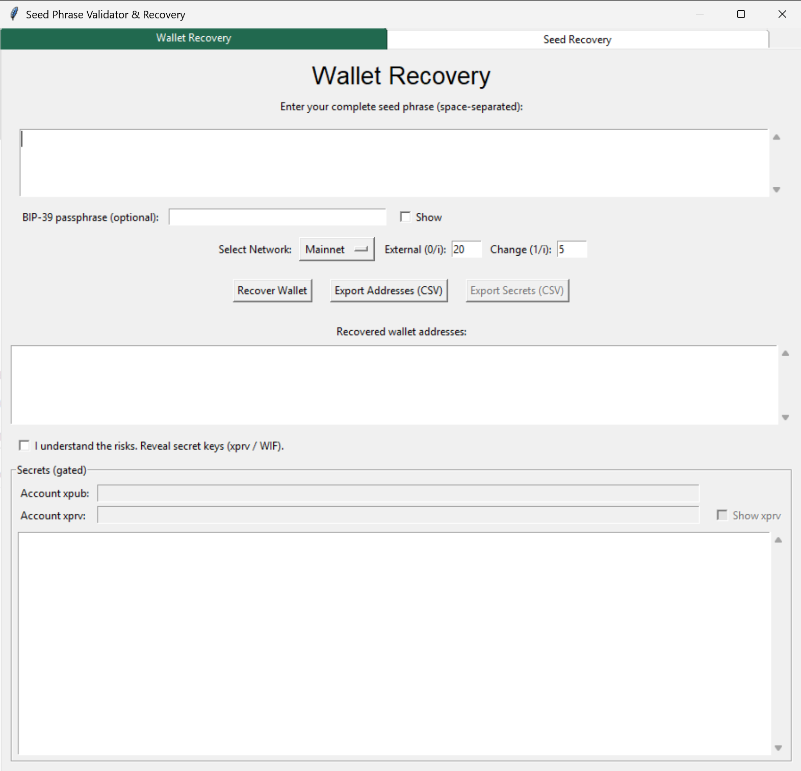 A Python-based Tkinter GUI application designed for seed phrase validation and wallet recovery. It allows users to recover missing or partial wallet seed phrases by leveraging BIP-39 and BIP-44 standards. This application is specifically designed for cryptocurrency wallet recovery with support for Mainnet and Testnet addresses.